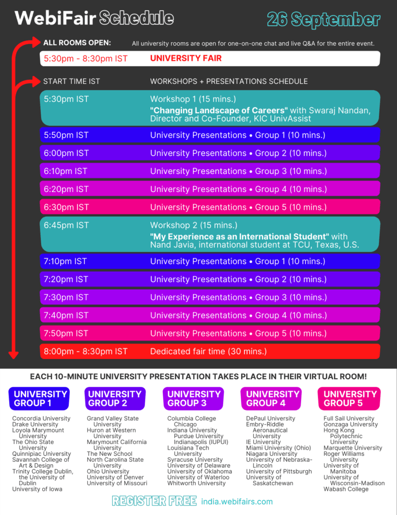 September 28, 2020Meet 40 top universities including Waterloo, Ohio State, Hong Kong Polytechnic, Trinity College, LMU, IUPUI, NCSU, UW Madison, Pepperdine, Syracuse, UConn and more at the virtual university fair, WebiFair!
