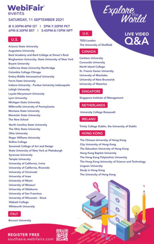 September 14, 2021We wanted to reach out to share details of our upcoming South Asia WebiFair on Saturday, 11 September from 5:30 – 8:00pm IST where students of Partap world school, Pathankot will have the opportunity to meet with 60+ global universities from 8 countries . This exclusive higher education virtual fair event is open for students from Grade 9-12, parents, teachers and counselors. Participating universities are from Canada, Italy, Ireland, Hong Kong, Netherlands, Singapore, U.K and the .U.S.
