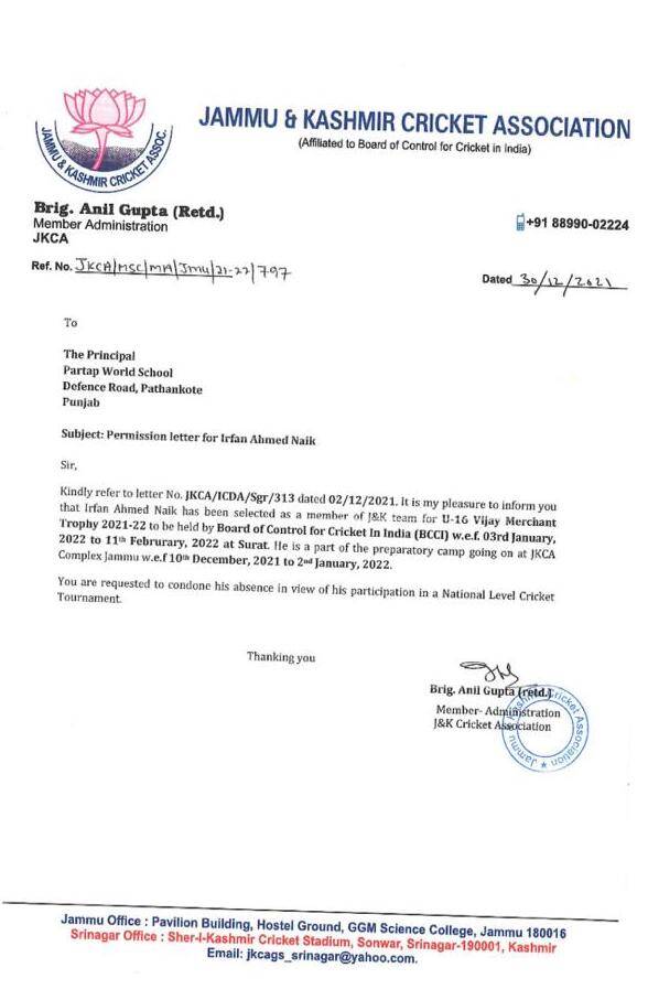 It is pertinent to mention here that irfan Ahmed Naik is a residential student at Partap world School, Pathankot and also enrolled at Harbhajan cricket academy at PWS, Pathankot.