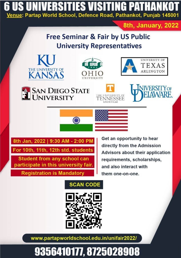 January 3, 20226 US Public Universities are travelling to visit Partap World School, Pathankot to attend the fair where the students can meet with university representatives.